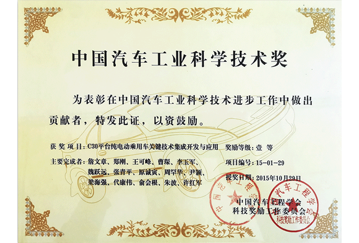 中国汽车工业科学技术奖一等奖(C30平台纯电动乘用车关键技术集成开发与应用)